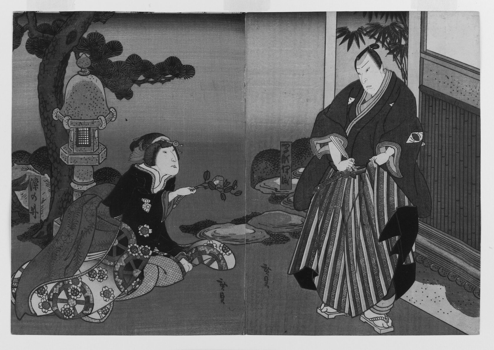 Сцена из пьесы Chuko buyuden. Предлагая ему камелию — символ стойкости — Соменои (слева) прощается со своим мужем, героем Иори, перед тем как отправиться в бордель. Таким образом она соберет деньги, необходимые для возвращения утраченной картины, которую им доверил их господин.