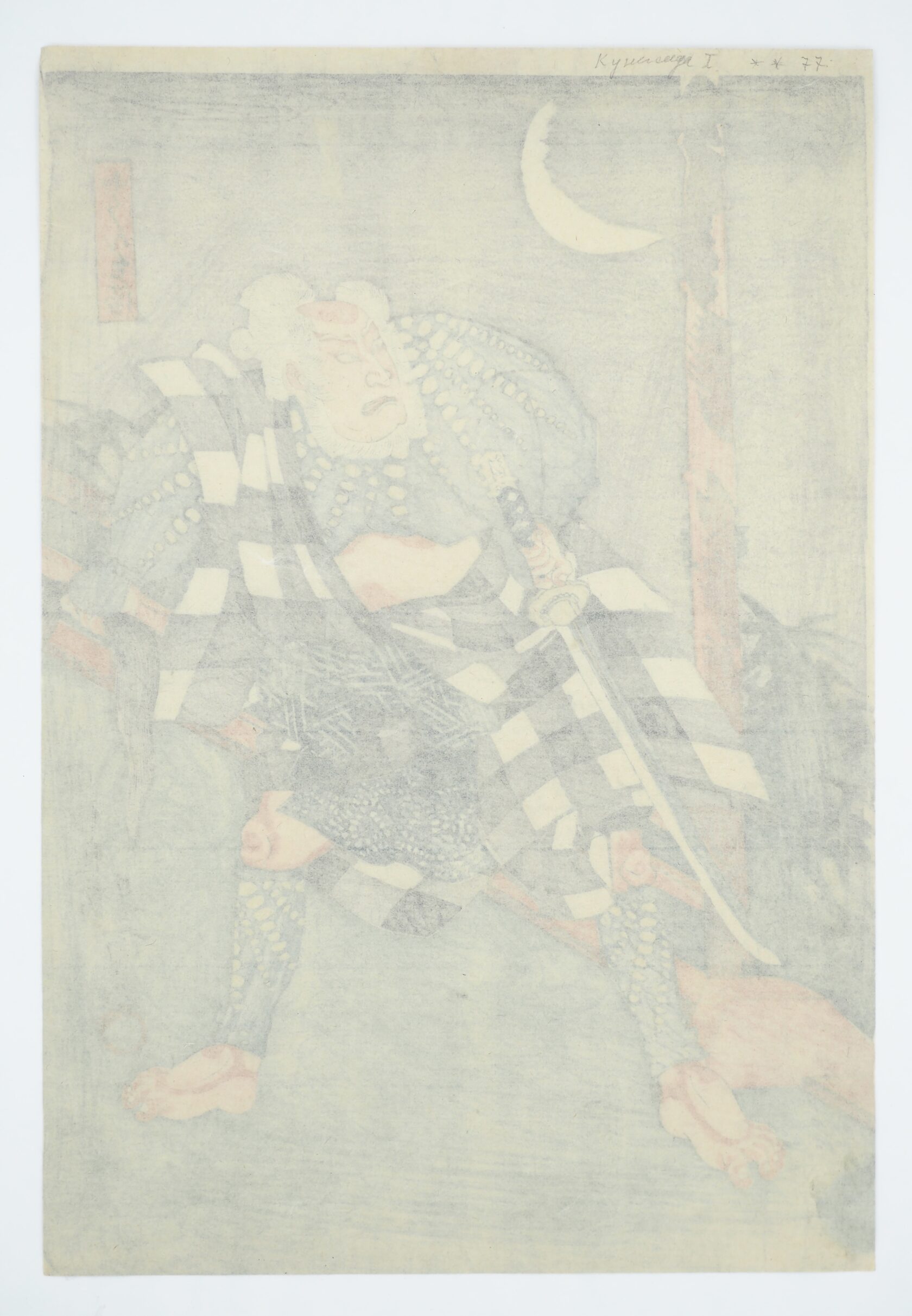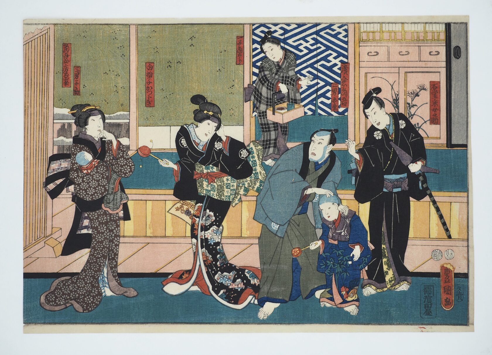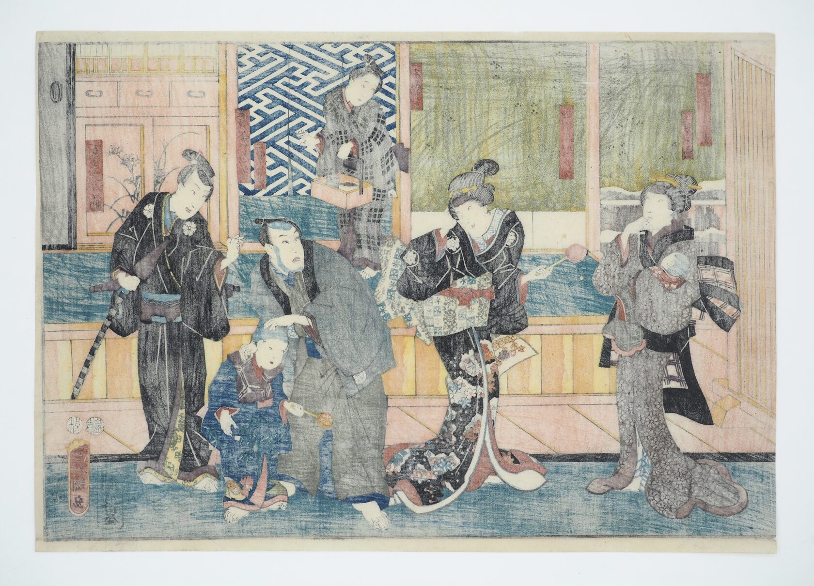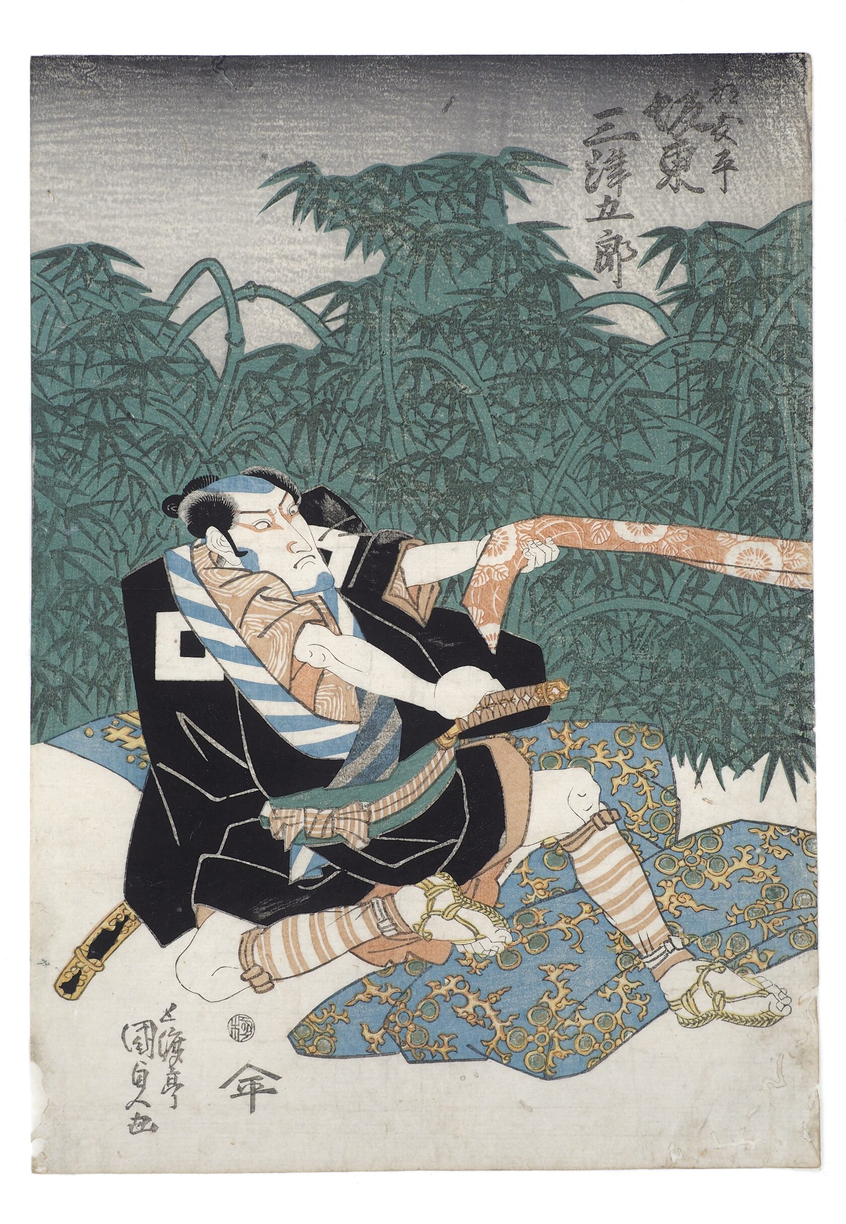 На гравюре изображена сцена театра кабуки. Редкое горизонтальное расположение. Возникает трудность с датировкой: