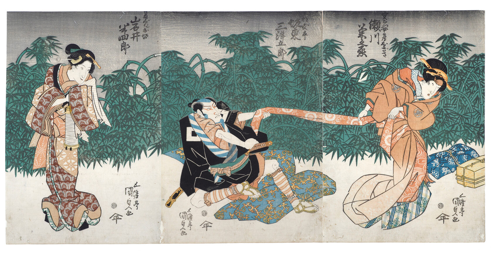 Сцена из пьесы кабуки. Утагава Кунисада, 1810е годы