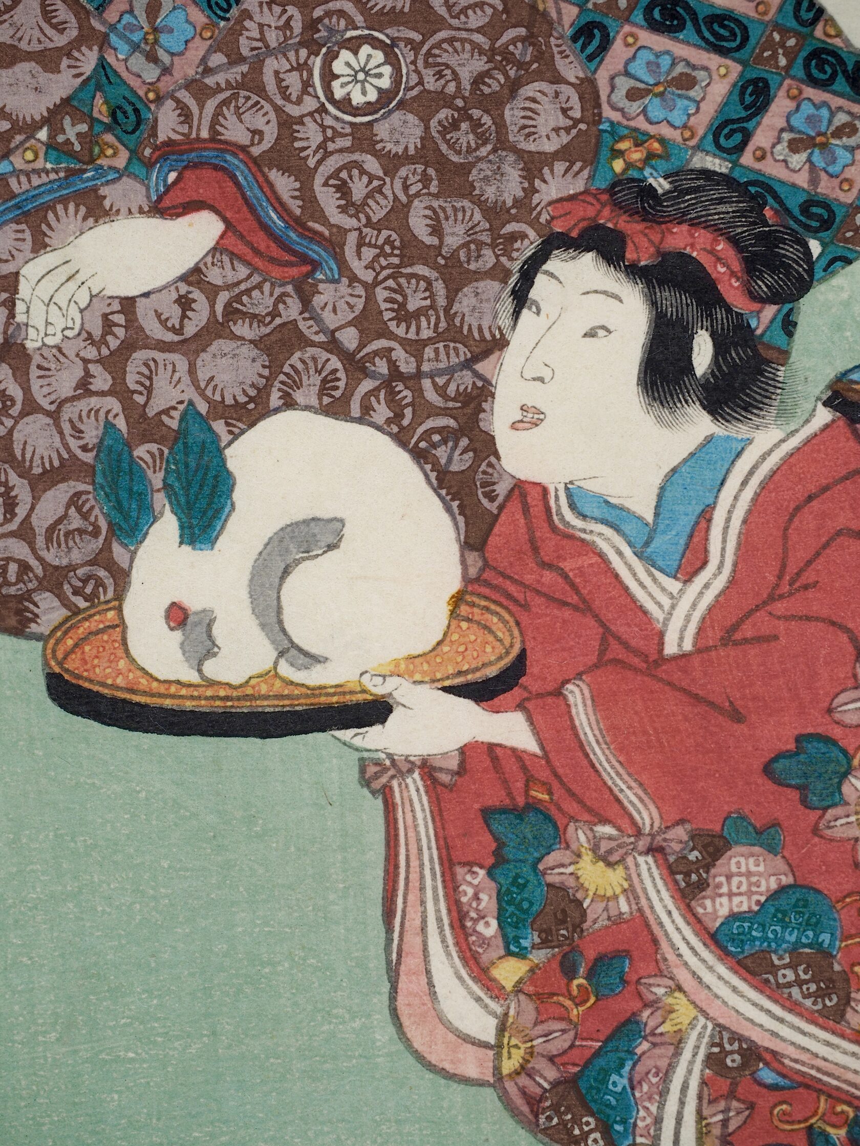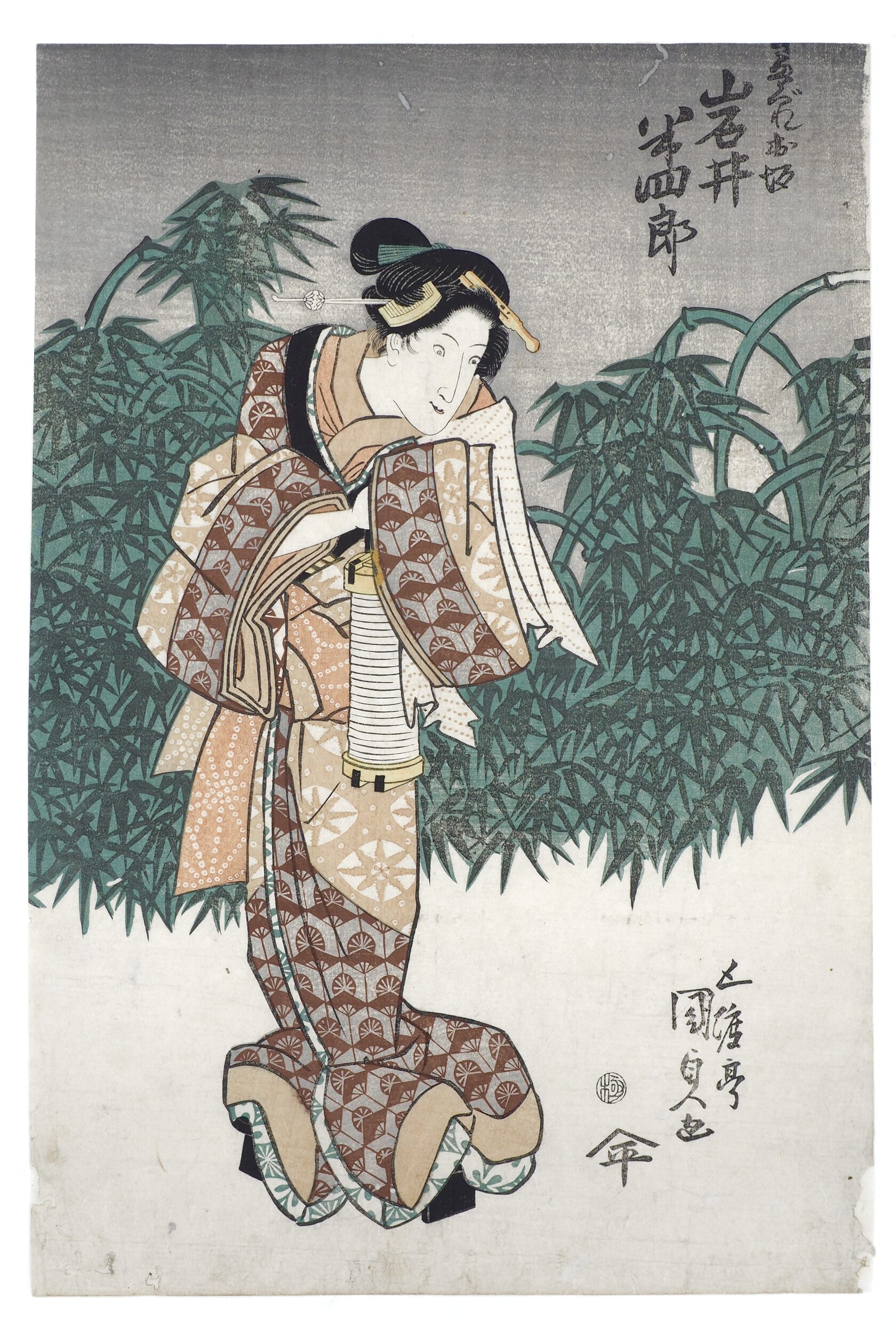 2 лист:Ивай Кумесабуро II в образе красавицыс портретом в руке. Актер Ивай Хансиро VI (1799 - 1836) носил имя Ивай Кумесабуро II (Iwai Kumesaburo II) с 1812 по 1832 год. Он был выдающимся оннагата (исполнитель женских ролей) начала XIX века. Знаменит тем, что исполнял несколько ролей в одном представлении. Актер заболел и умер во время одного из таких представлений, в котором играл 15 ролей в одной пьесе.
