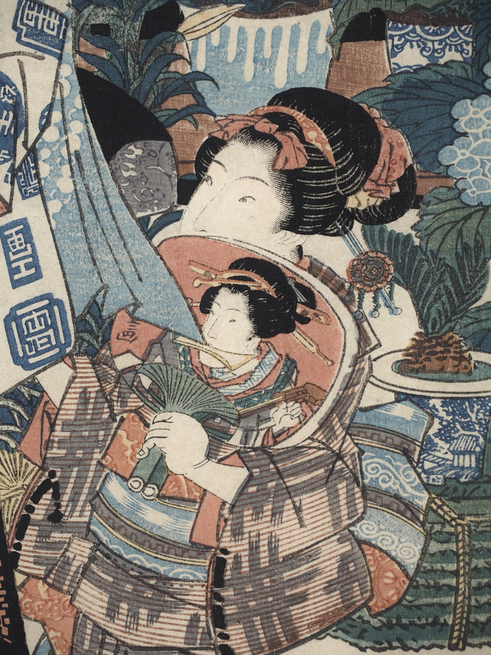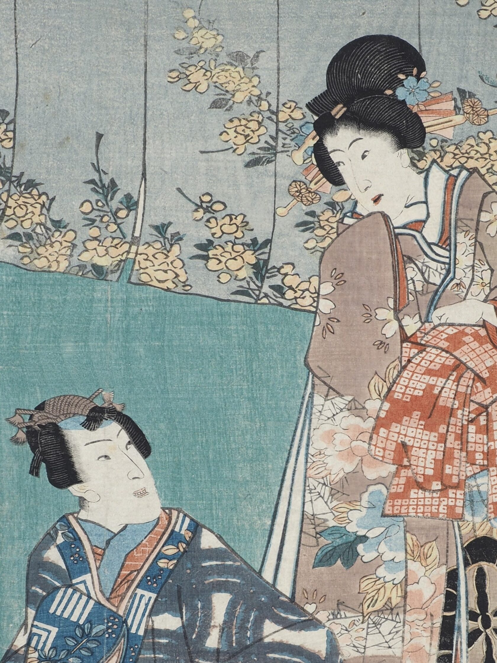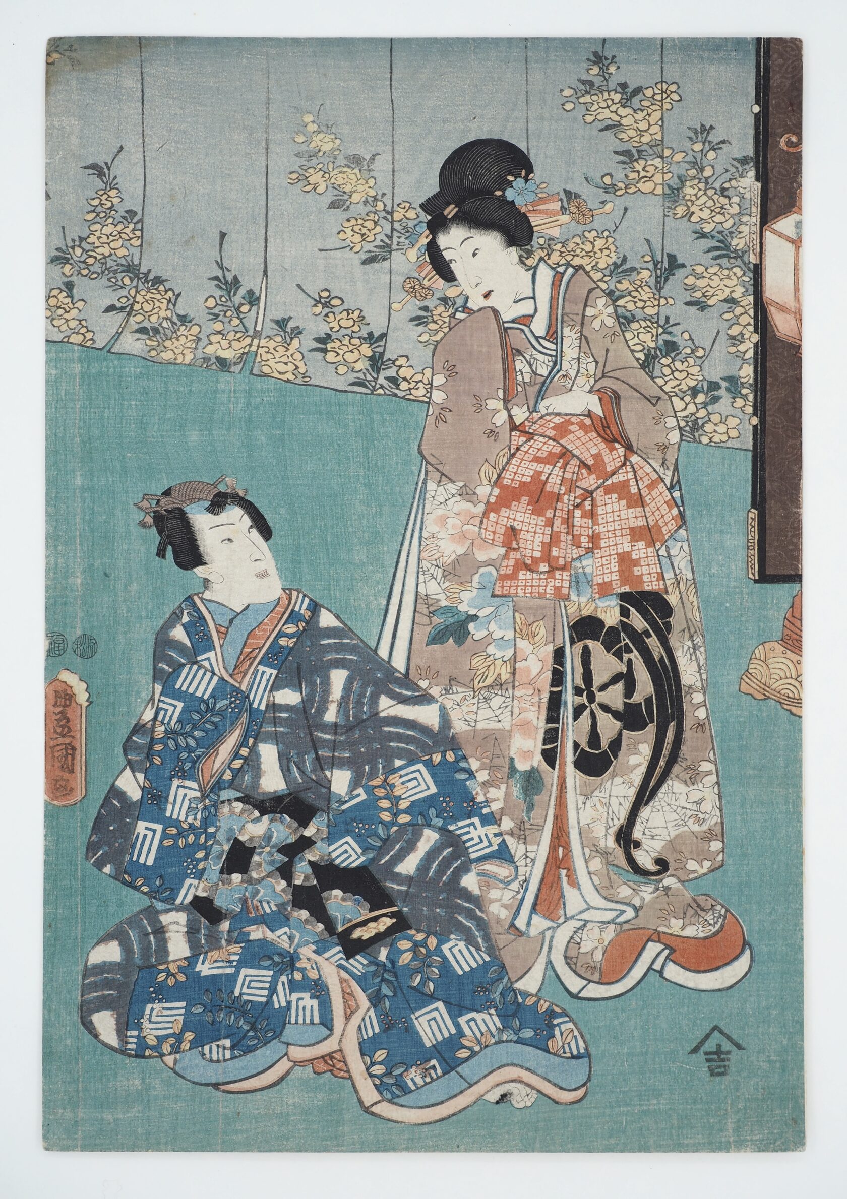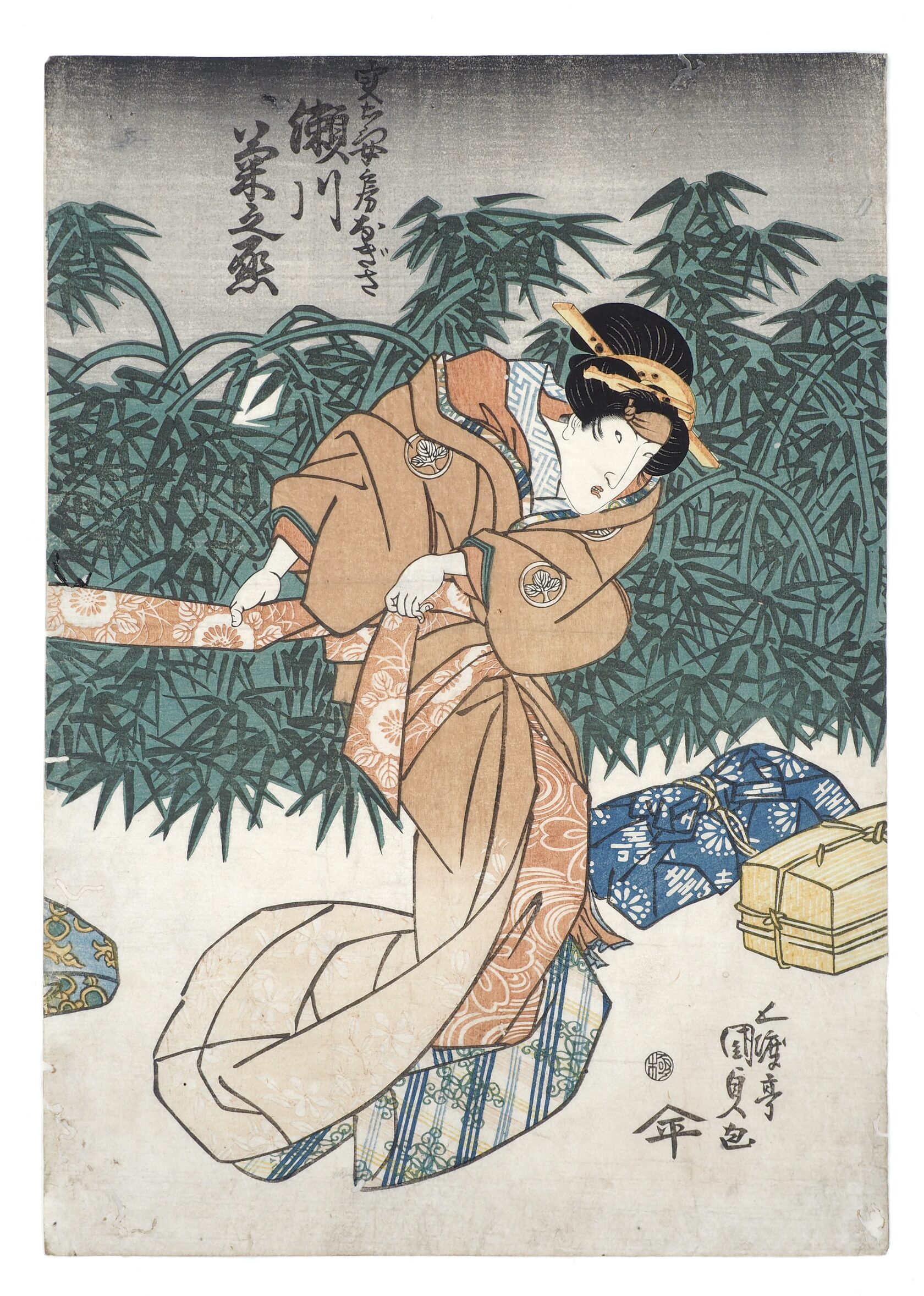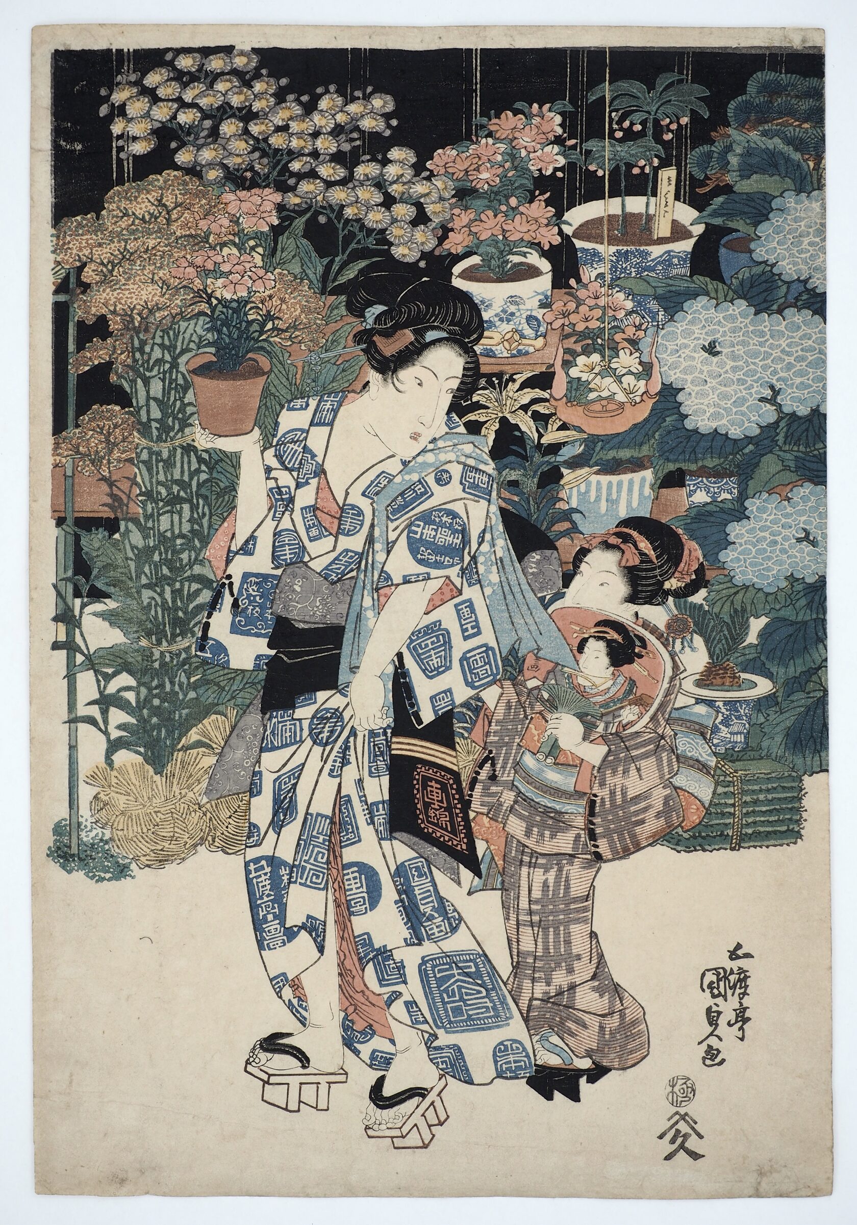 Красавица в летнем кимоно Юката, на котором обыграны имена издателя и Кунисады, стоит перед прилавком с цветами. Лист из триптиха «Энничи но кэй» (ゑん日乃景),
