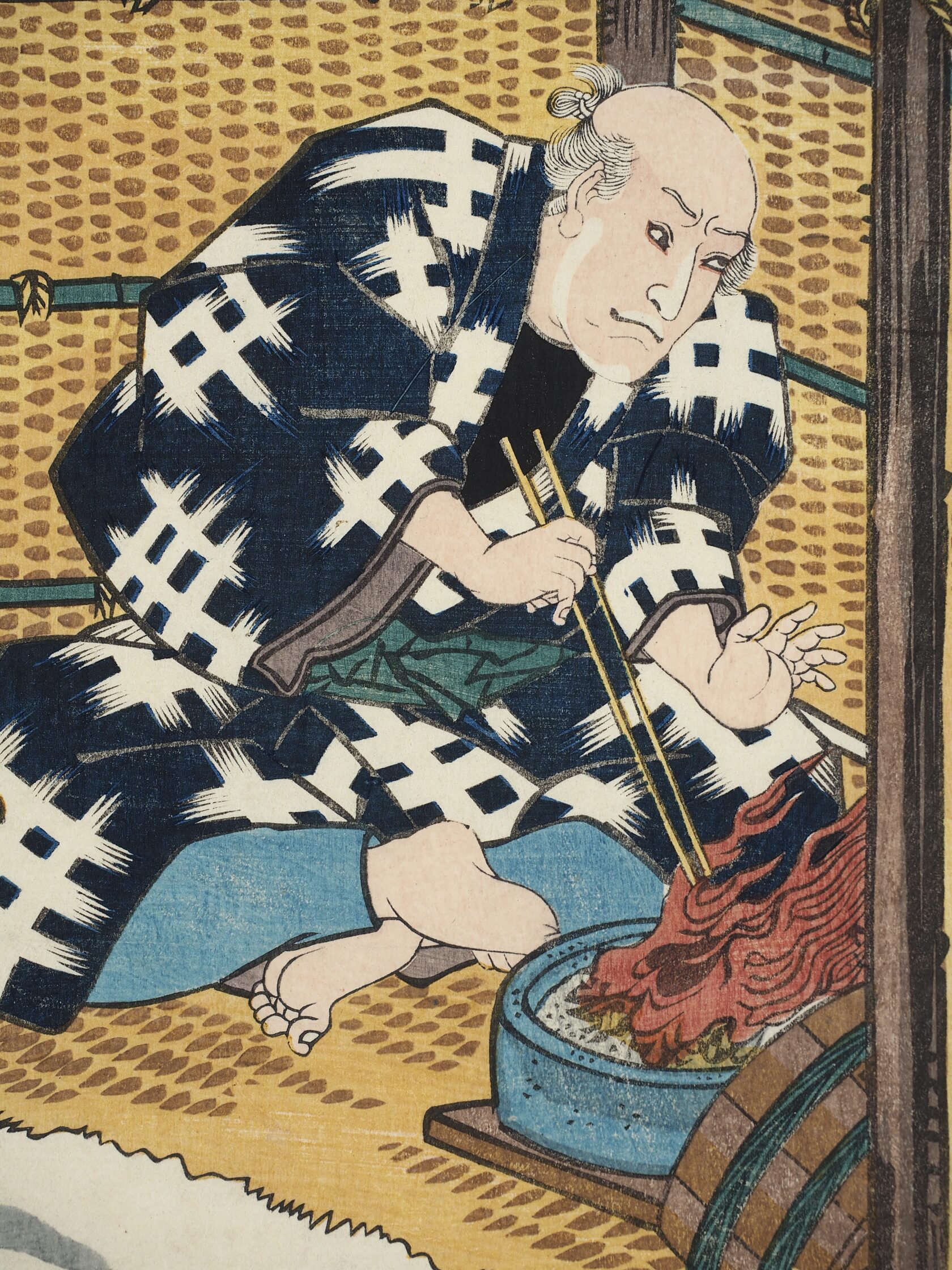 Пьеса театра кабуки "Toki-ni Uttari Oyatsu no Taiko". Актеры: Iwai Hanshirô V, Bandô Mitsugorô III, Segawa Kikunojô V