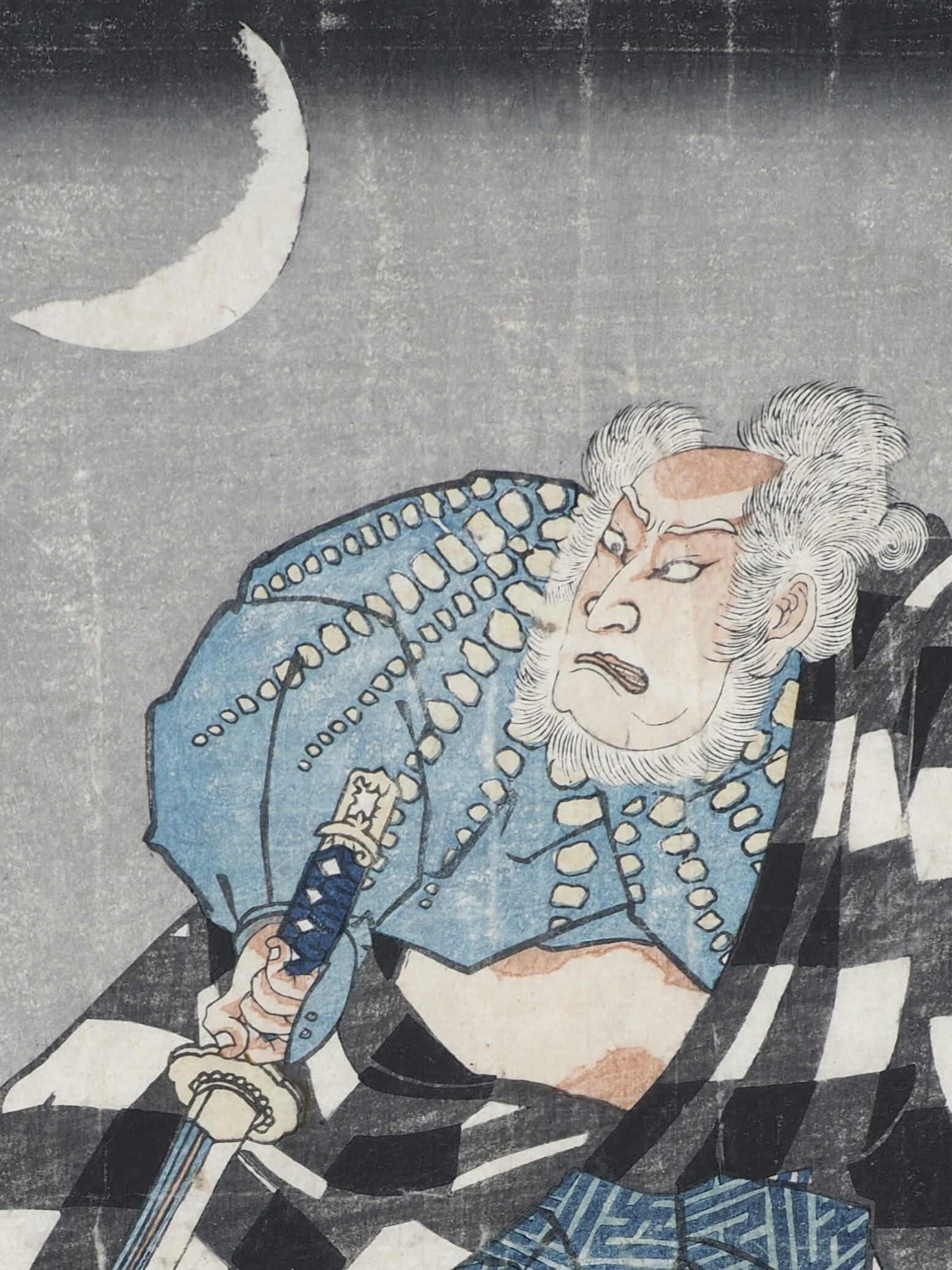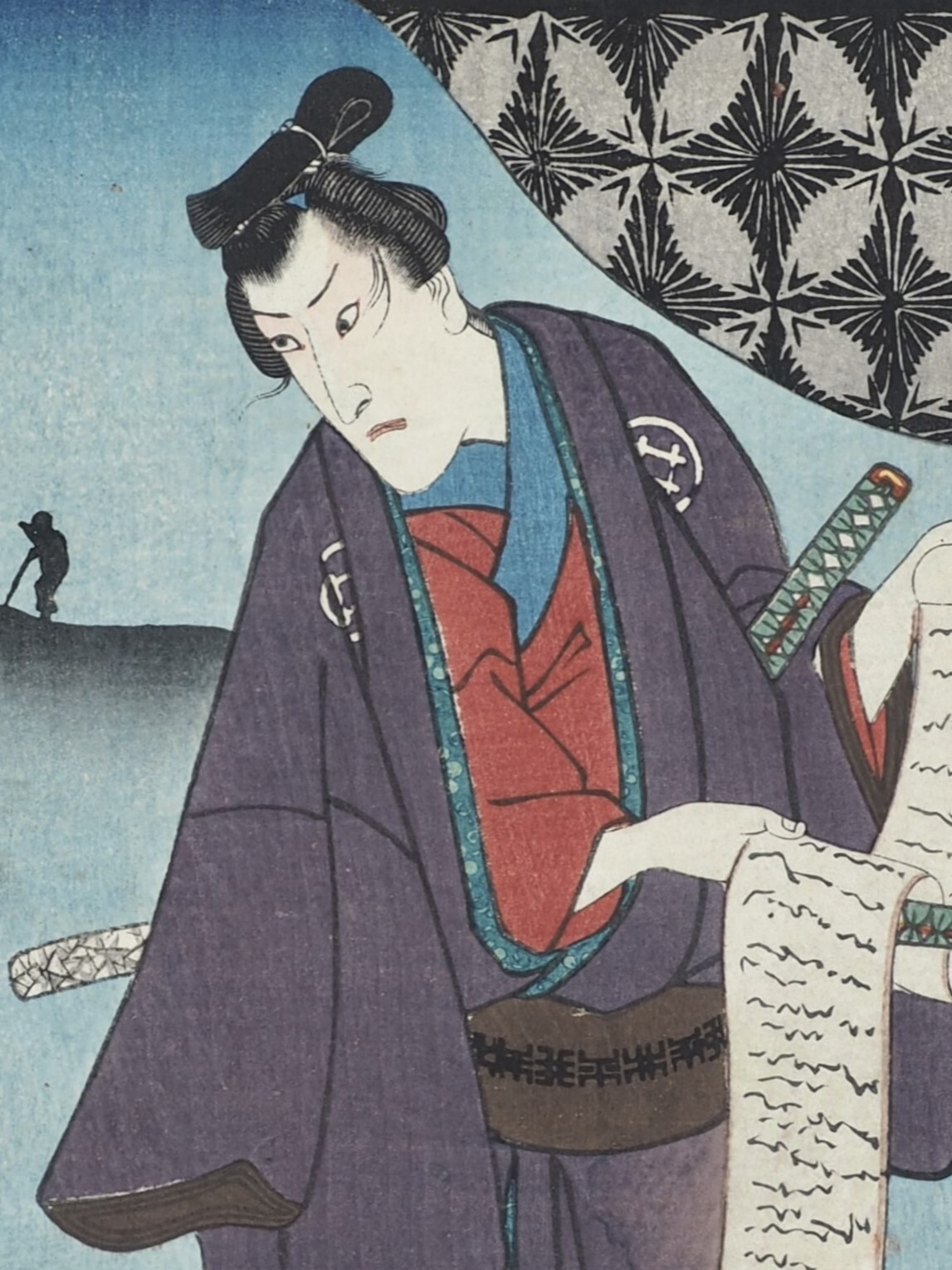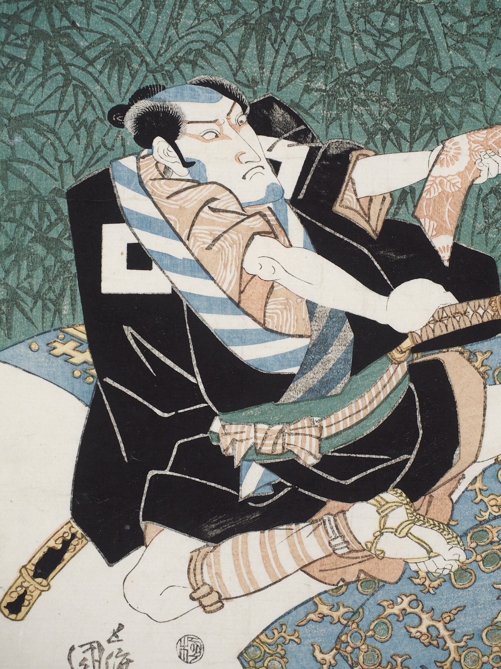 1 лист: Ивай Хансиро VII в образе самурая с портретом в руке. Ивай Хансиро VII (Iwai Hanshirô VII) - брат Хансиро VI (изображен на 2 листе).