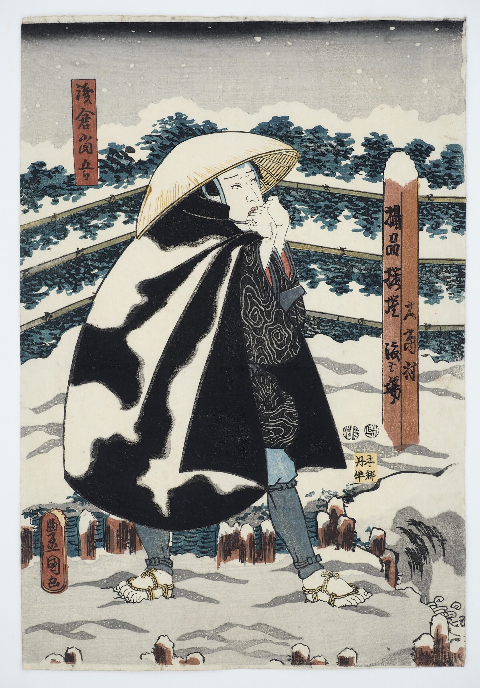 Пьеса: Sakura Soshi Gonichi Bundan Прекрасная сцена из пьесы кабуки «Сакура соси гоничи бундан» показывающая, как Асакура Того покидает свою семью во время снежной бури. Будучи мэром города, он напрямую обратился к сёгуну с просьбой о снижении налогов для своего города, минуя коррумпированного губернатора. Зная, что это будет означать для него смертную казнь, он разрывается между исполнением своего долга и расставанием с близкими. Его жена и дети наблюдают из окна своего дома, как он в последний раз оглядывается через плечо, его соломенная шляпа уже покрыта снегом. Жена держит на руках маленького ребёнка, а двое маленьких мальчиков смотрят в окно и машут на прощание. В ролях: Итикава Кодандзи IV в роли Асакуры Того, Оноэ Кикудзиро II в роли его жены Омине, Итикава Итисабуро в роли его старшего сына Тотаро и Бандо Мацудзиро в роли второго сына Кунимацу.