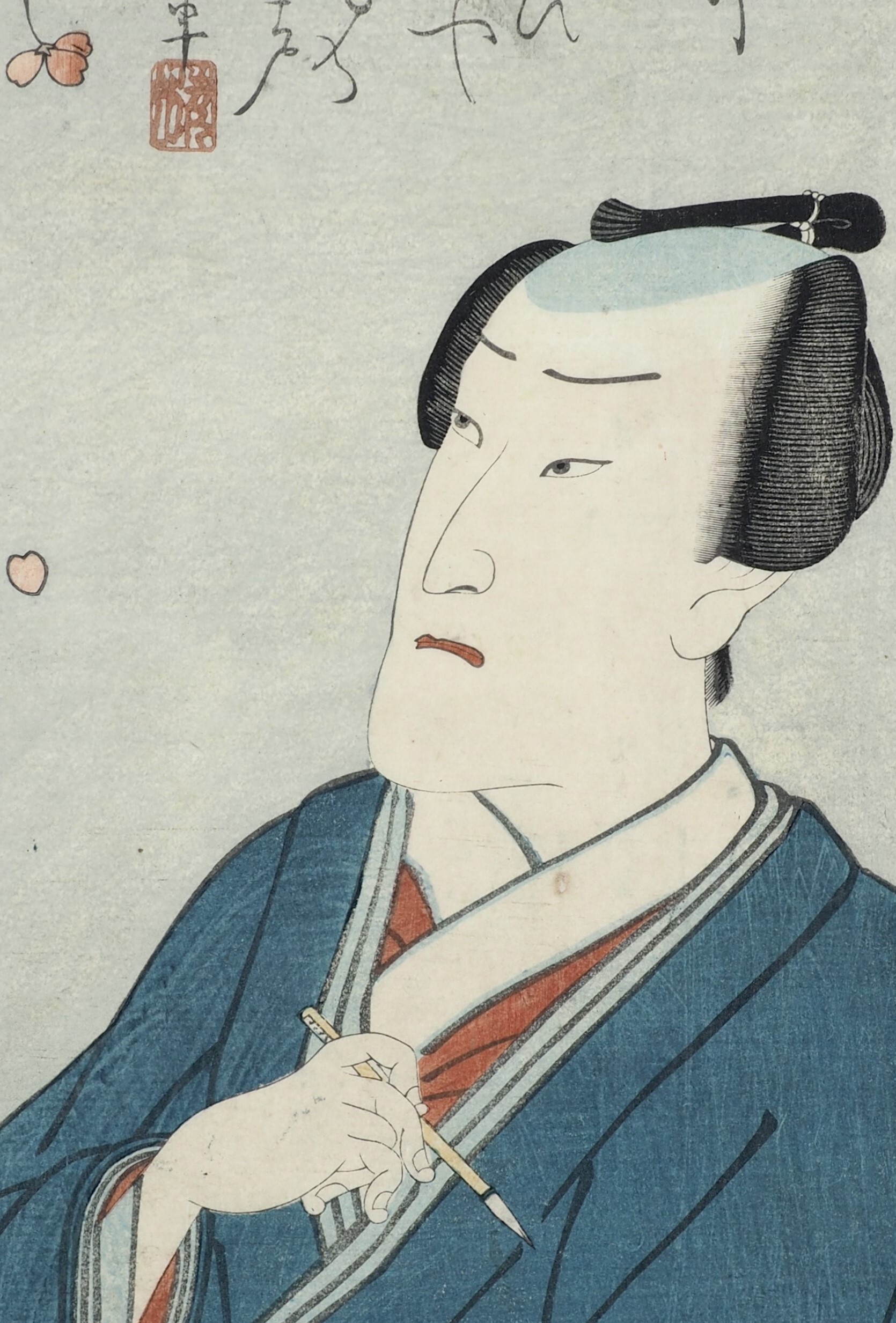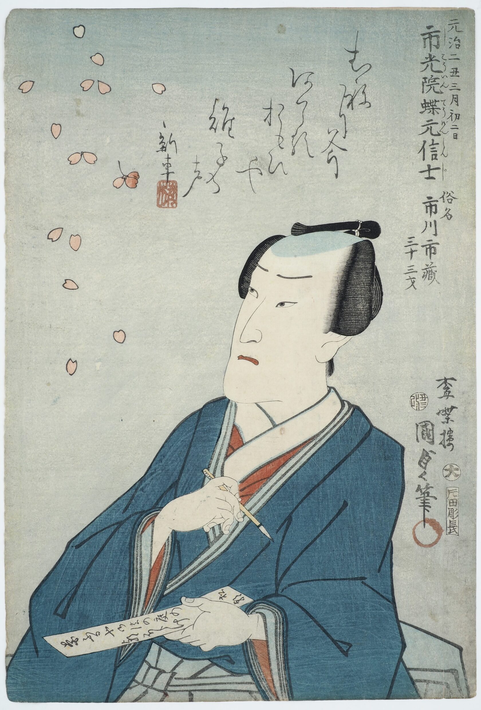 Мемориальный портрет (сини-э) актера театра кабуки Итикавы Итидзо III (Ichikawa Ichizo III). На гравюре изображен актер, пишущий стихотворение. Лепестки сакуры, падающие вокруг него, символизируют быстротечность жизни.