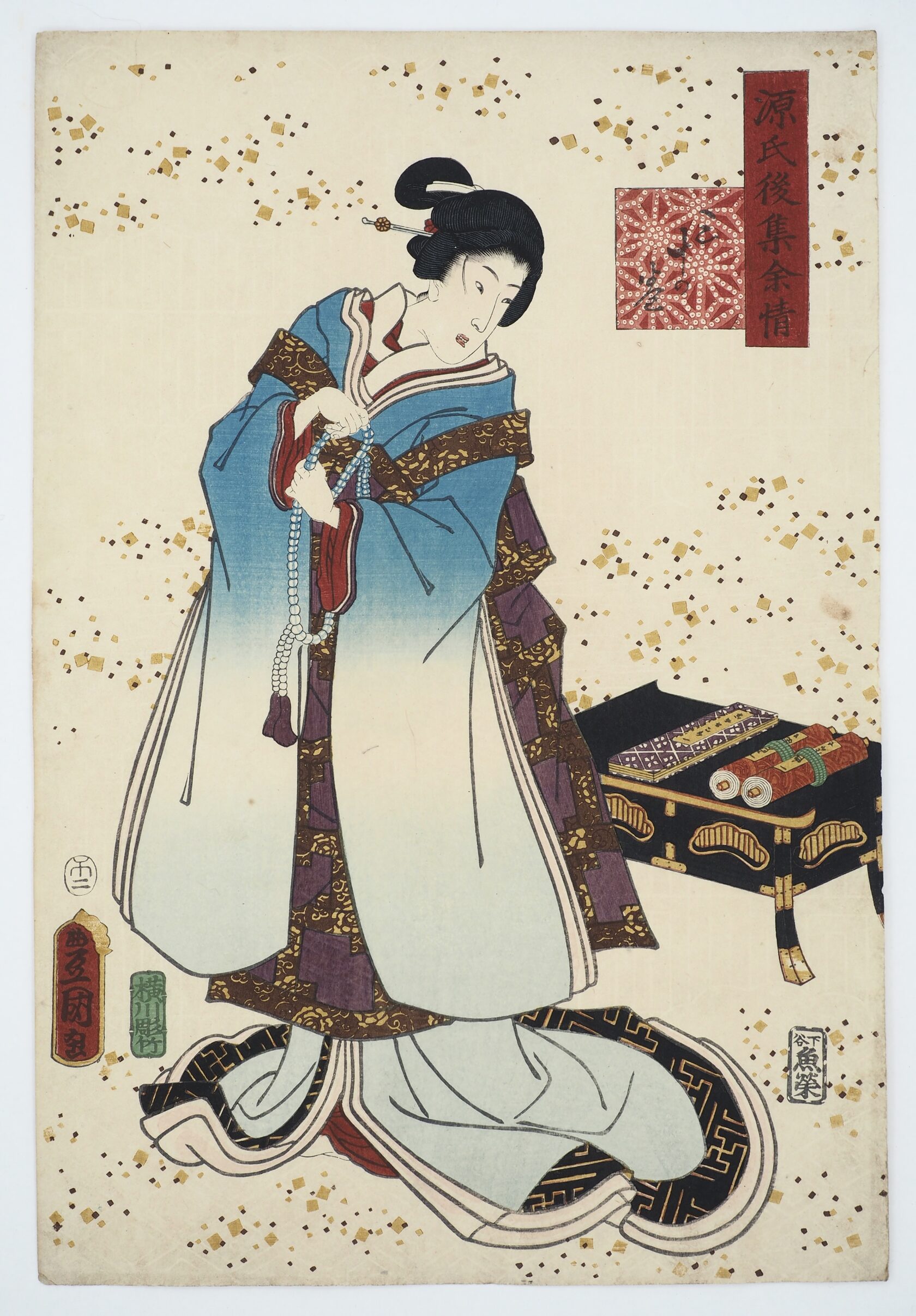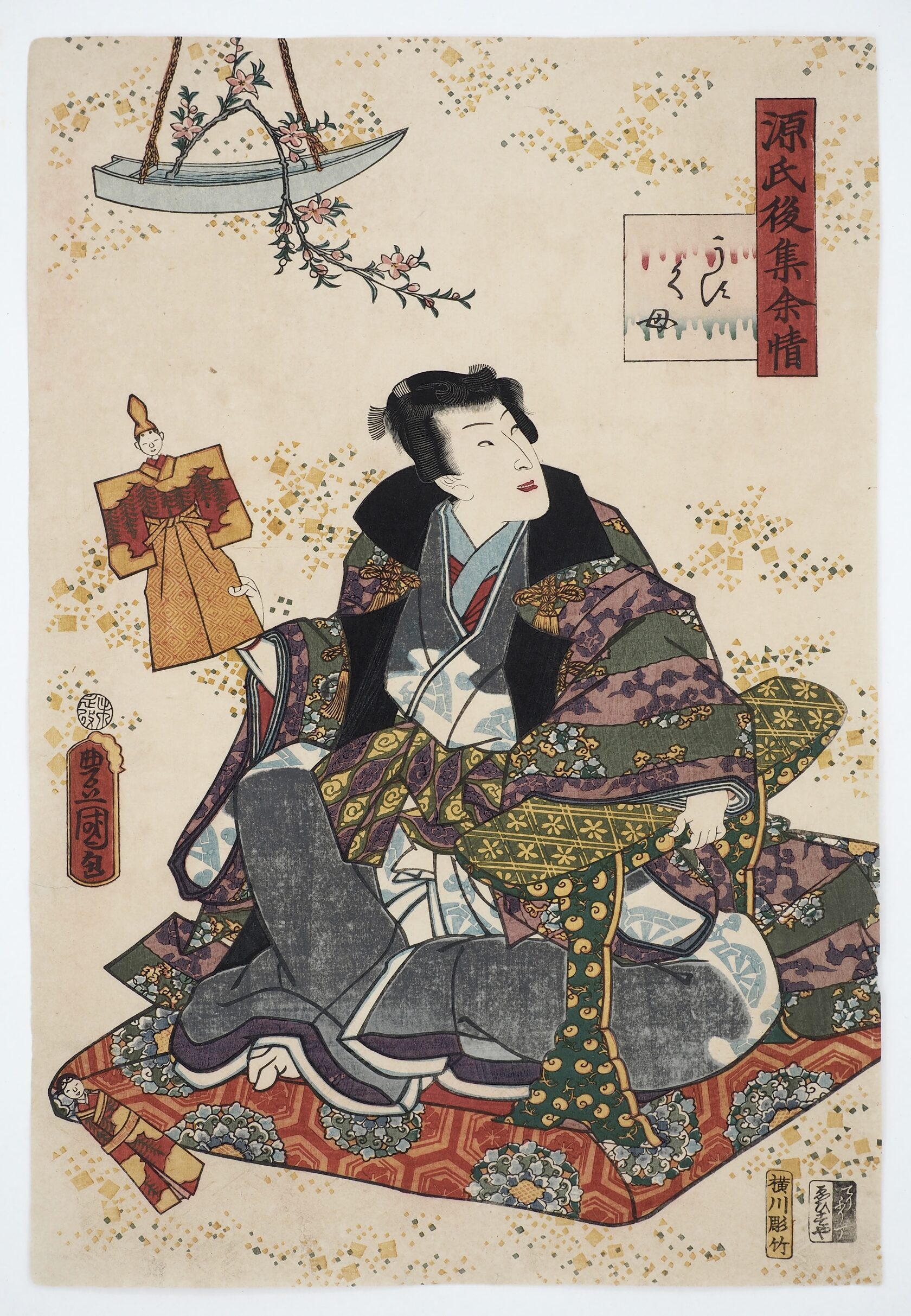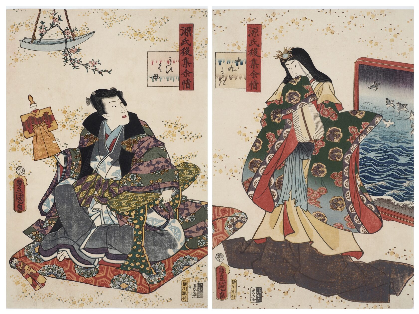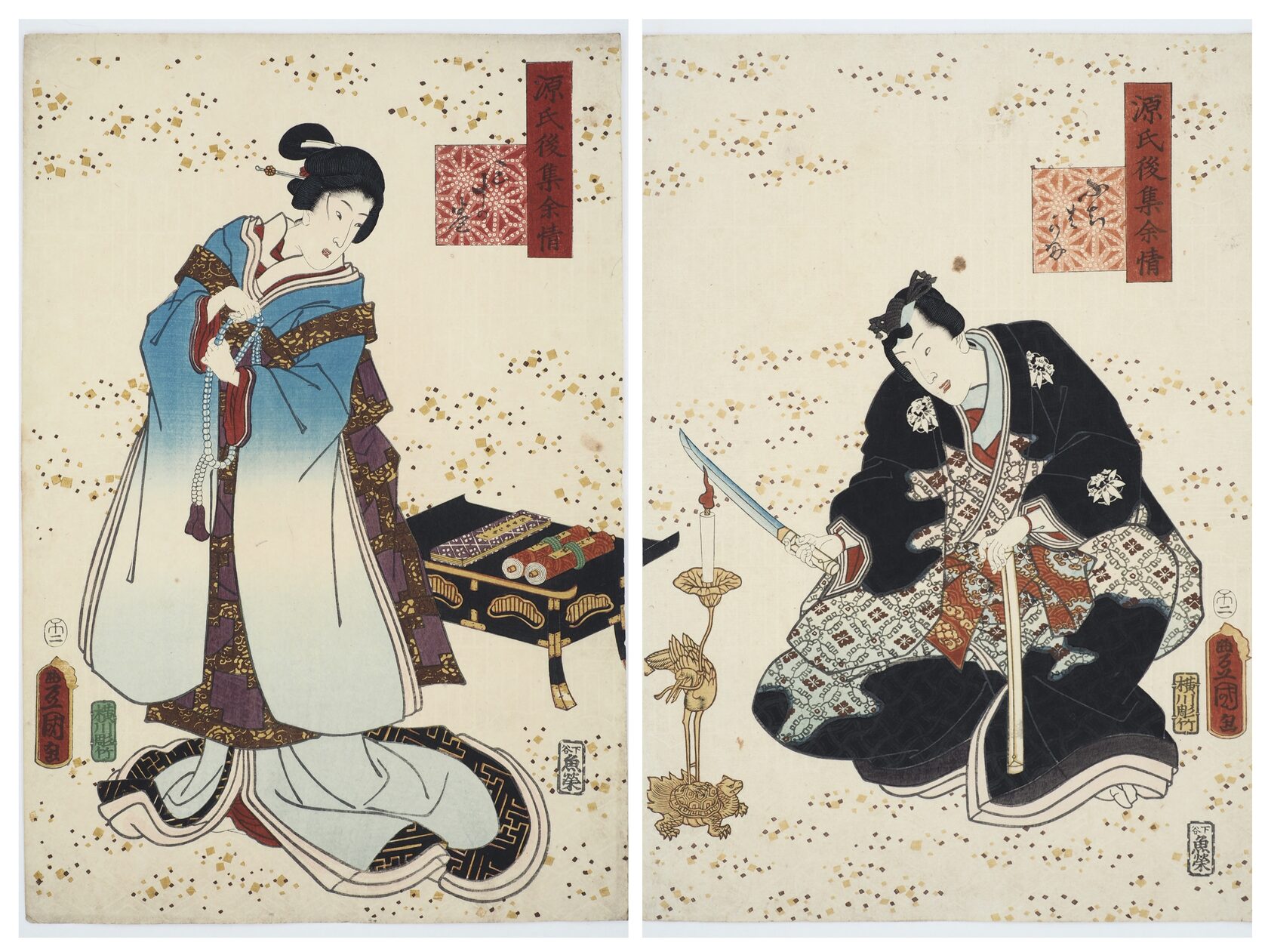 Глава 19, из серии «Нескончаемые чувства собрания сочинений о Гэндзи» (Genji goshû yojô) [игра слов с «Пятьдесят четыре главы повести о Гэндзи» (Genji gojûyojô)]. Диптих.