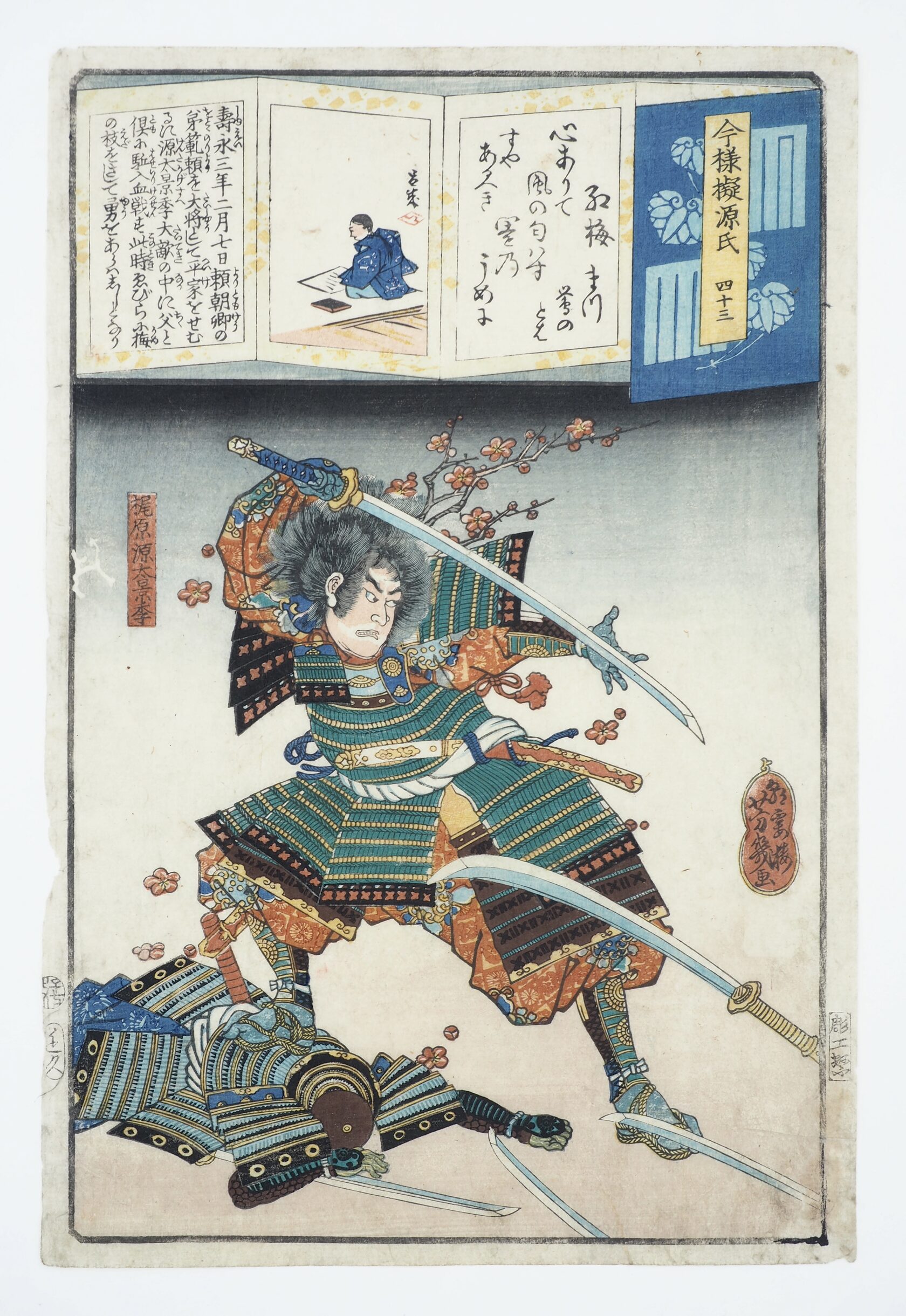 歌川 芳幾 — его творчество очень разнообразно: портреты женщин и знаменитых актёров, военно-исторические серии, сюжеты литературных произведений, жанровые зарисовки, афиши театральных спектаклей, городские виды, изображения разных животных. В наступившую эпоху Мэйдзи (1868-1912), в которой произошли большие политические и экономические изменения, Утагава Ёсиику занимался и новым видом ксилографии — «разноцветными новостями» (ньюс нисики-э), газетными иллюстрациями на темы историй об убийствах и кражах, призраках и исчезновениях людей, несчастной любви ...